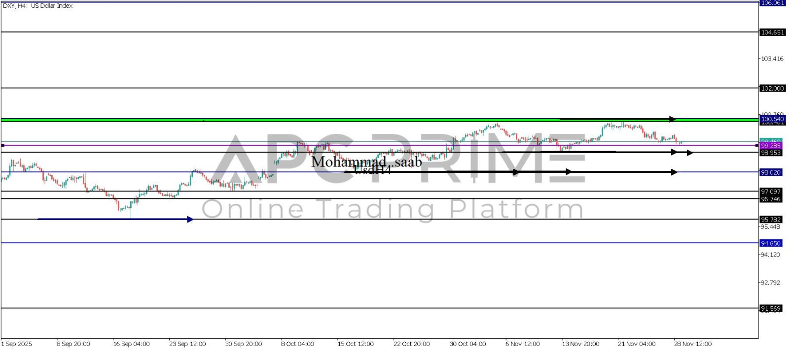 المنطقة الأهم (99.285) ثبات السعر أعلى المنطقة الأهم يتجه السعر إلى منطقة المقاومة (100.540-100.401) احتمالية الارتداد منها ممكنة ولكن باختراقها وإغلاق أعلى بشمعة أربع ساعات يتجه السعر إلى منطقة المقاومة (102.000)