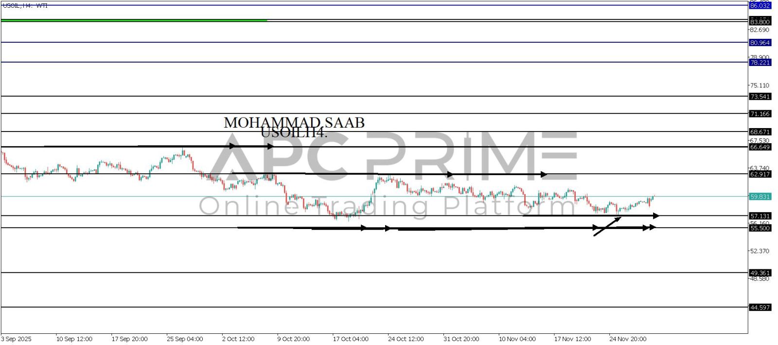 المنطقة الأهم (57.131) احتمالية الارتداد منها ممكنة ولكن بكسرها وإغلاق أسفل بشمعة أربع ساعات يتجه السعر إلى منطقة الدعم (55.500) احتمالية الارتداد منها ممكنة ولكن بكسرها وإغلاق أسفل بشمعة أربع ساعات يتجه السعر إلى منطقة الدعم (49.361)