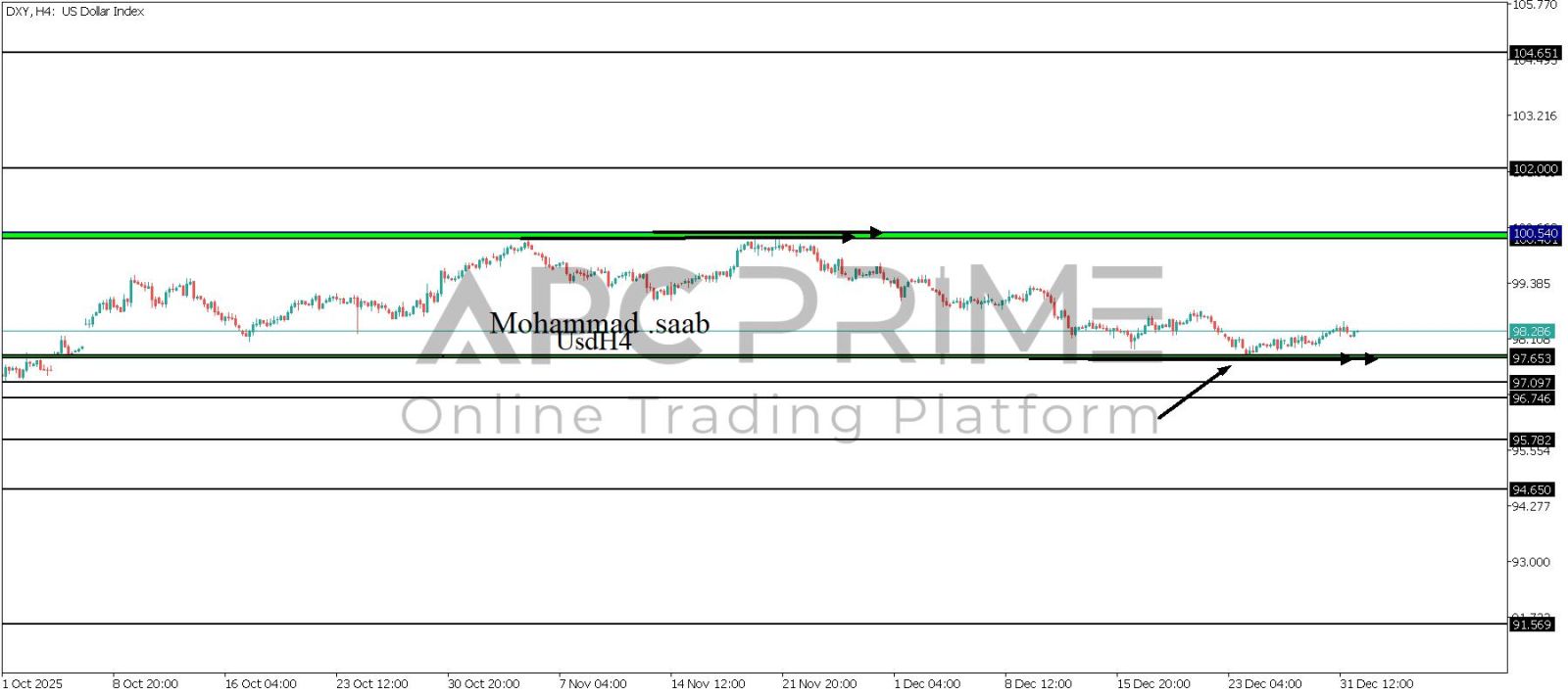 المنطقة الأهم (97.653-97.656) ثبات السعر أعلى المنطقة الأهم يتجه السعر إلى منطقة المقاومة (100.540-100.401) احتمالية الارتداد منها ممكنة ولكن باختراقها وإغلاق أعلى بشمعة أربع ساعات يتجه السعر إلى منطقة المقاومة (102.000)