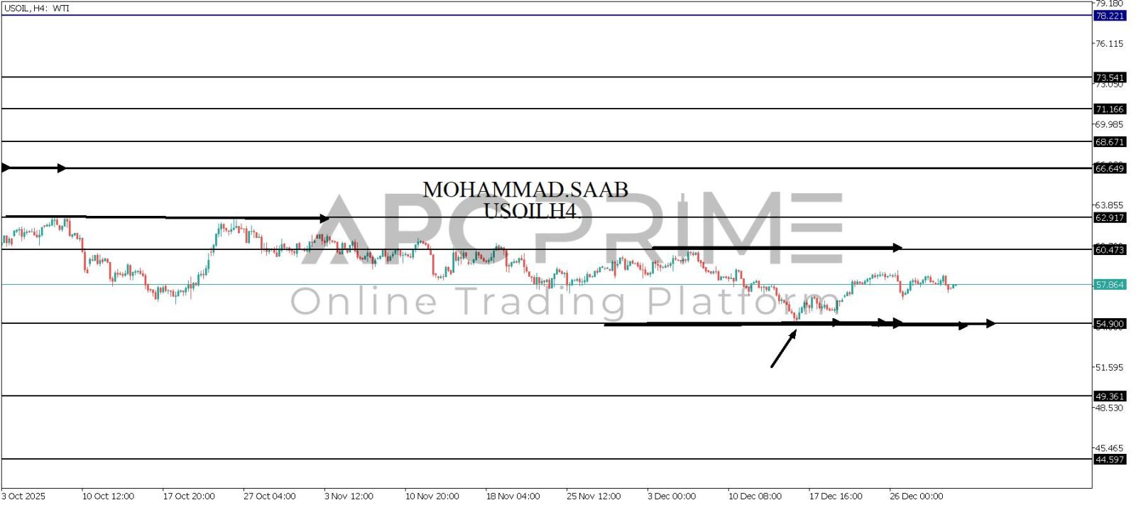 المنطقة الأهم (54.900) ثبات السعر أعلى المنطقة الأهم يتجه السعر إلى منطقة المقاومة (60.473) احتمالية الارتداد منها ممكنة ولكن باختراقها وإغلاق أعلى بشمعة أربع ساعات يتجه السعر إلى منطقة المقاومة (62.917)