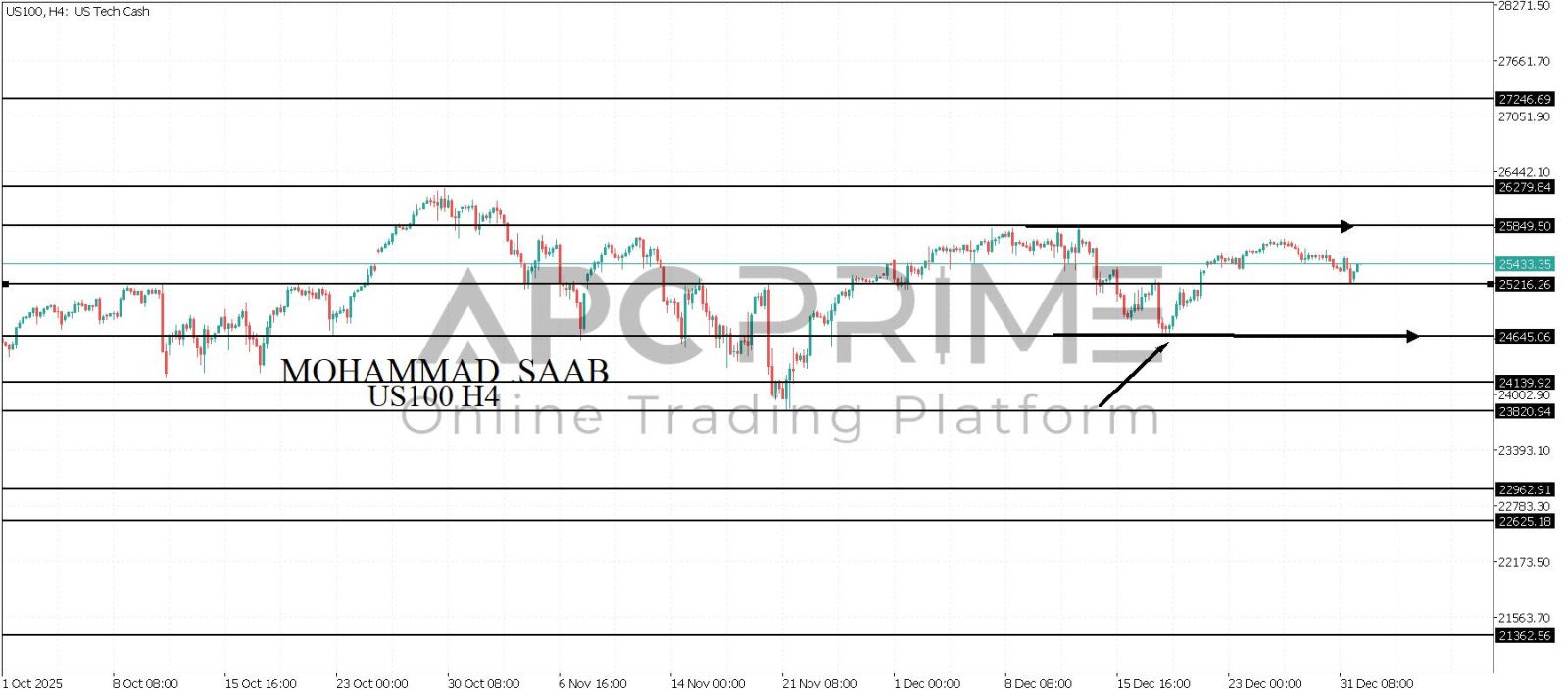 المنطقة الأهم (25216) ثبات السعر أعلى المنطقة الأهم يتجه السعر إلى منطقة المقاومة (25849) احتمالية الارتداد منها ممكنة ولكن باختراقها وإغلاق أعلى بشمعة أربع ساعات يتجه السعر إلى منطقة المقاومة (26279)