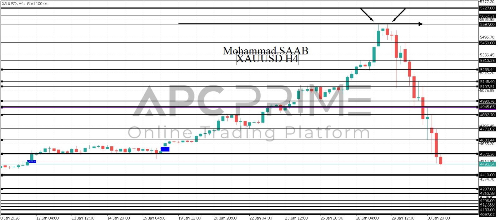 المنطقة الأهم (4572) ثبات السعر أسفل المنطقة الأهم يتجه السعر إلى منطقة الدعم (4410-4400) احتمالية الارتداد منها ممكنة ولكن بكسرها وإغلاق أسفل بشمعة أربع ساعات يتجه السعر إلى منطقة الدعم (4297)