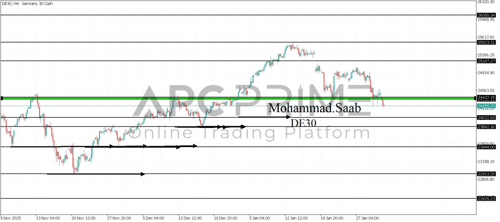 المنطقة الأهم (24427-24390) احتمالية الارتداد منها ممكنة ولكن باختراقها وإغلاق أعلى بشمعة أربع ساعات يتجه السعر إلى منطقة المقاومة (25147) احتمالية الارتداد منها ممكنة ولكن باختراقها وإغلاق أعلى بشمعة أربع ساعات يتجه السعر إلى منطقة المقاومة (25513)