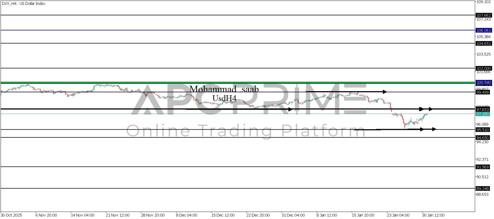 المنطقة الأهم (97.653) احتمالية الارتداد منها ممكنة ولكن باختراقها وإغلاق أعلى بشمعة أربع ساعات يتجه السعر إلى منطقة المقاومة (99.499) احتمالية الارتداد منها ممكنة ولكن باختراقها وإغلاق أعلى بشمعة أربع ساعات يتجه السعر إلى منطقة المقاومة (100.401-100.540)