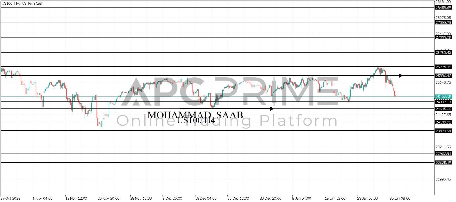 المنطقة الأهم (25886) احتمالية الارتداد منها ممكنة ولكن باختراقها وإغلاق أعلى بشمعة أربع ساعات يتجه السعر إلى منطقة المقاومة (26225) احتمالية الارتداد منها ممكنة ولكن باختراقها وإغلاق أعلى بشمعة أربع ساعات يتجه السعر إلى منطقة المقاومة (26763)