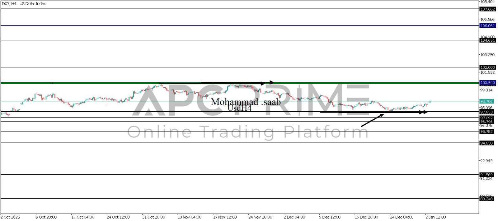 المنطقة الأهم (97.653) ثبات السعر أعلى المنطقة الأهم يتجه السعر إلى منطقة المقاومة (100.540-100.401) احتمالية الارتداد منها ممكنة ولكن باختراقها وإغلاق أعلى بشمعة أربع ساعات يتجه السعر إلى منطقة المقاومة (102.000)
