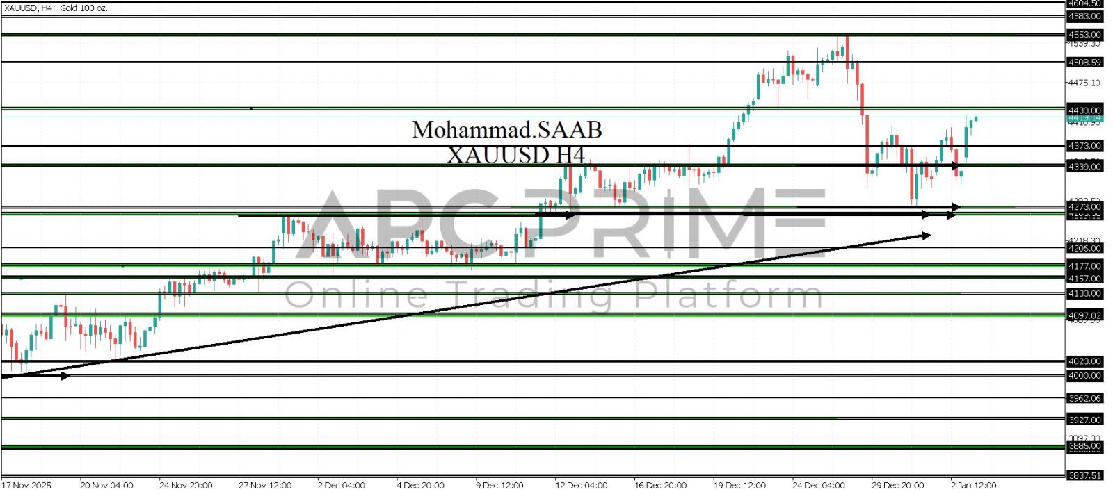 المنطقة الأهم (4430-4434) احتمالية الارتداد منها ممكنة ولكن باختراقها وإغلاق أعلى بشمعة أربع ساعات يتجه السعر إلى منطقة المقاومة (4553-4550) احتمالية الارتداد منها ممكنة ولكن باختراقها وإغلاق أعلى بشمعة أربع ساعات يتجه السعر إلى منطقة المقاومة (4583)