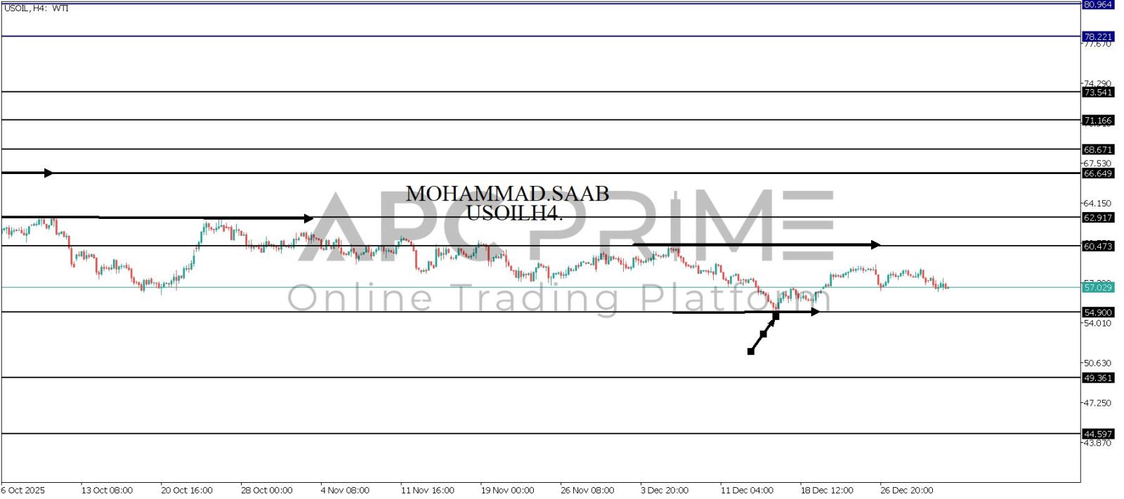 المنطقة الأهم (54.900) ثبات السعر أعلى المنطقة الأهم يتجه السعر إلى منطقة المقاومة (60.473) احتمالية الارتداد منها ممكنة ولكن باختراقها وإغلاق أعلى بشمعة أربع ساعات يتجه السعر إلى منطقة المقاومة (62.917)