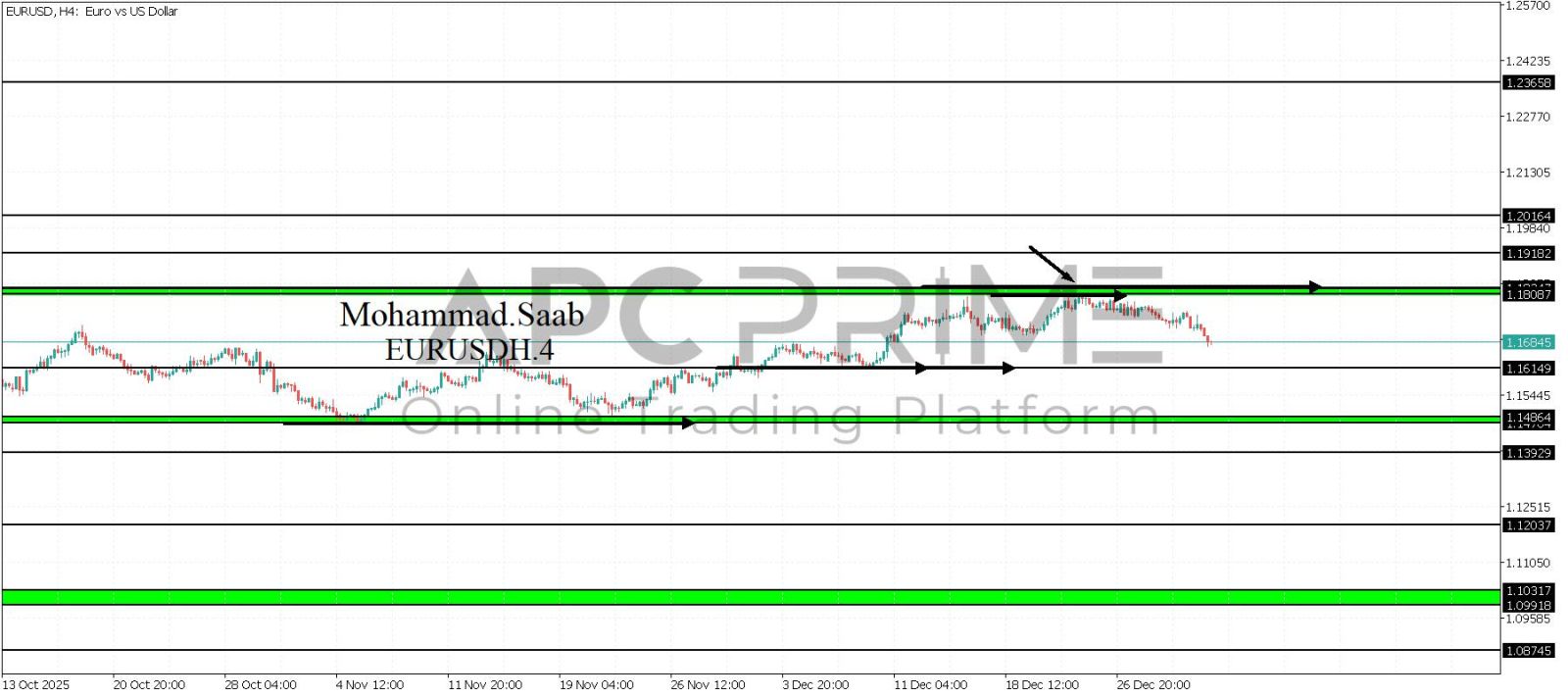 المنطقة الأهم (1.18087-1.18247) ثبات السعر أسفل المنطقة الأهم يتجه السعر إلى منطقة الدعم (1.16149) احتمالية الارتداد منها ممكنة ولكن بكسرها وإغلاق أسفل بشمعة أربع ساعات يتجه السعر إلى منطقة الدعم (1.14864-1.14704)