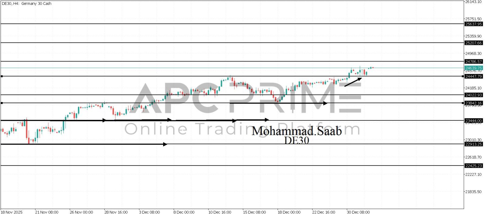 المنطقة الأهم (24447) ثبات السعر أعلى المنطقة الأهم يتجه السعر إلى منطقة المقاومة (24786) احتمالية الارتداد منها ممكنة ولكن باختراقها وإغلاق أعلى بشمعة أربع ساعات يتجه السعر إلى منطقة المقاومة (25207)