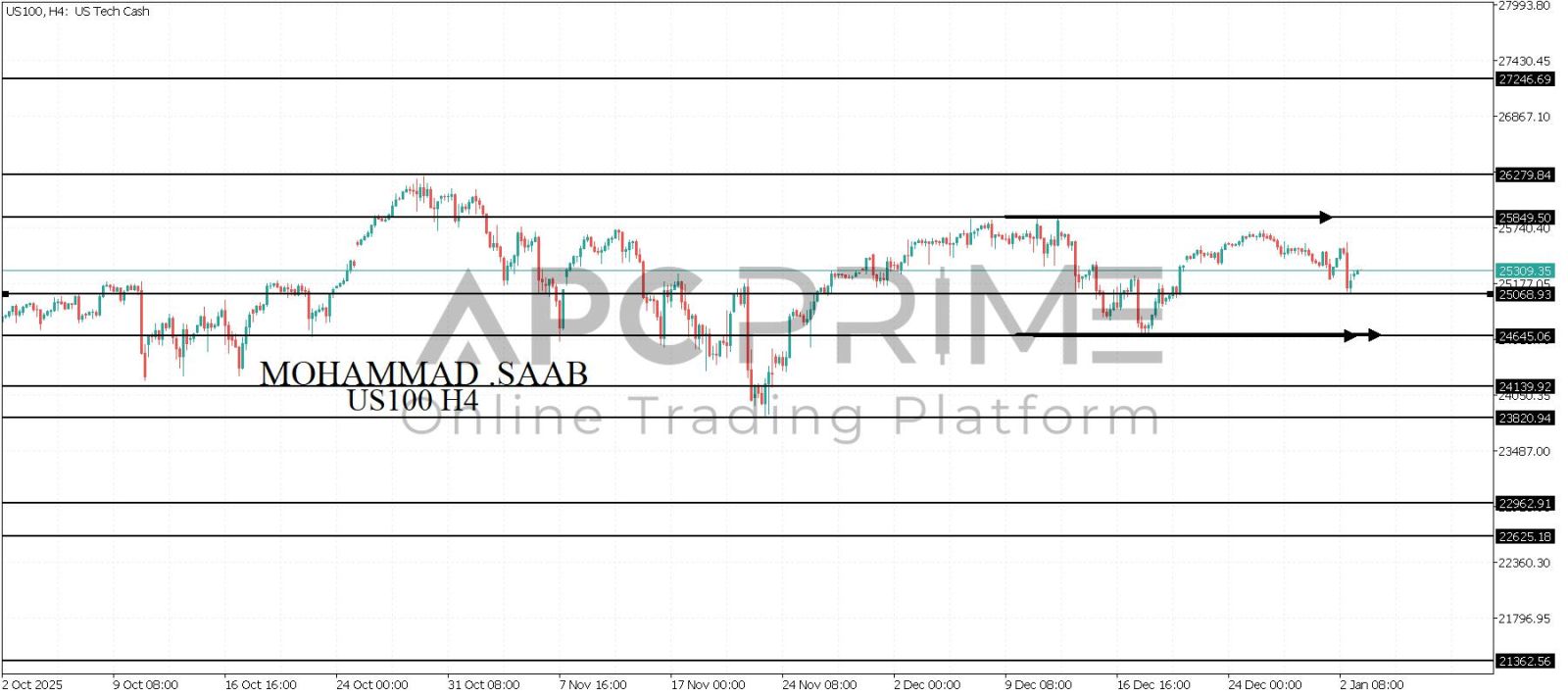 المنطقة الأهم (25068) ثبات السعر أعلى المنطقة الأهم يتجه السعر إلى منطقة المقاومة (25849) احتمالية الارتداد منها ممكنة ولكن باختراقها وإغلاق أعلى بشمعة أربع ساعات يتجه السعر إلى منطقة المقاومة (26279)