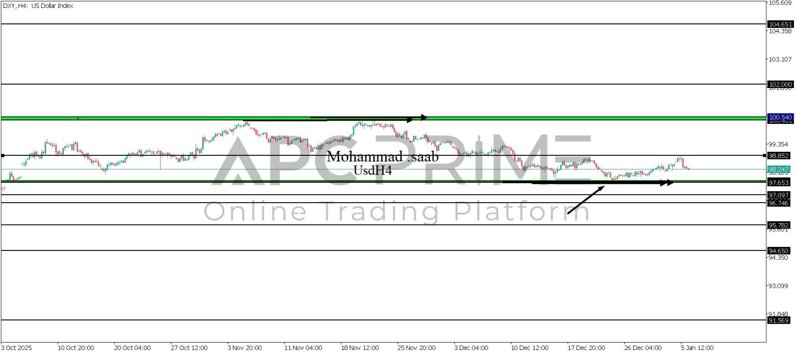المنطقة الأهم (98.852) احتمالية الارتداد منها ممكنة ولكن باختراقها وإغلاق أعلى بشمعة أربع ساعات يتجه السعر إلى منطقة المقاومة (100.401-100.540) احتمالية الارتداد منها ممكنة ولكن باختراقها وإغلاق أعلى بشمعة أربع ساعات يتجه السعر إلى منطقة المقاومة (102.000)