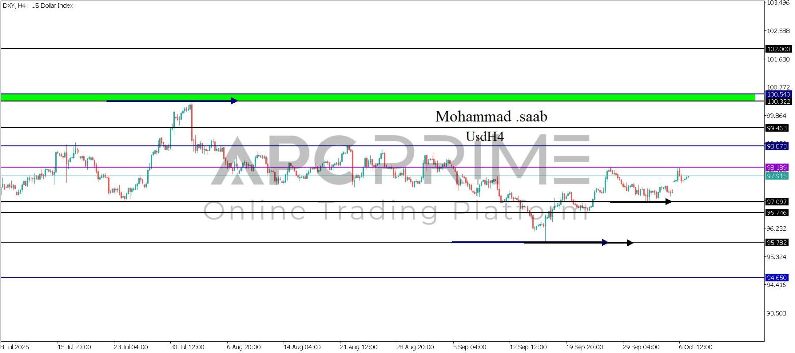 المنطقة الأهم (97.097) ثبات السعر أعلى المنطقة الأهم يتجه السعر إلى منطقة المقاومة (98.189) احتمالية الارتداد منها ممكنة ولكن باختراقها وإغلاق أعلى بشمعة أربع ساعات يتجه السعر إلى منطقة المقاومة (98.873)