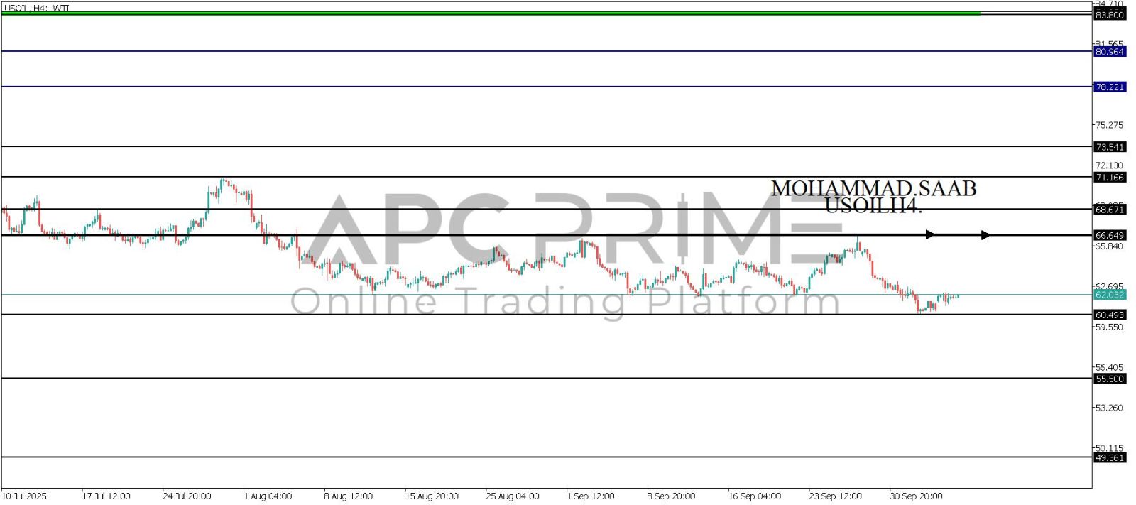المنطقة الأهم (60.493) ثبات السعر أعلى المنطقة الأهم يتجه السعر إلى منطقة المقاومة (66.649) احتمالية الارتداد منها ممكنة ولكن باختراقها وإغلاق أعلى بشمعة أربع ساعات يتجه السعر إلى منطقة المقاومة (68.671)