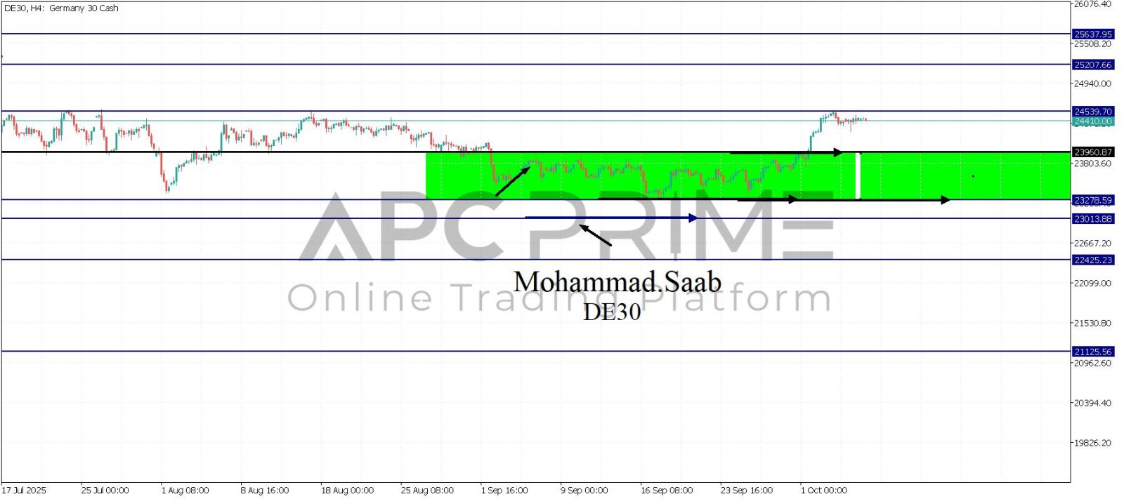 المنطقة الأهم (23960) ثبات السعر أعلى المنطقة الأهم يتجه السعر إلى منطقة المقاومة (24539) احتمالية الارتداد منها ممكنة ولكن باختراقها وإغلاق أعلى بشمعة أربع ساعات يتجه السعر إلى منطقة المقاومة (25207)