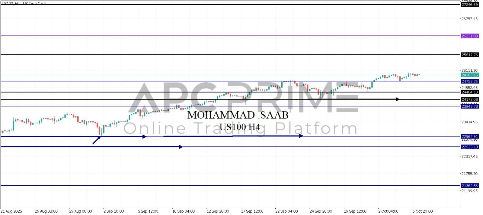 المنطقة الأهم (24752) ثبات السعر أعلى المنطقة الأهم يتجه السعر إلى منطقة المقاومة (25617) احتمالية الارتداد منها ممكنة ولكن باختراقها وإغلاق أعلى بشمعة أربع ساعات يتجه السعر إلى منطقة المقاومة (26231)