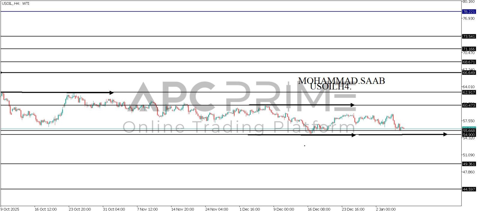 المنطقة الأهم (55.668) احتمالية الارتداد منها ممكنة ولكن بكسرها وإغلاق أسفل بشمعة أربع ساعات يتجه السعر إلى منطقة الدعم (49.361) احتمالية الارتداد منها ممكنة ولكن بكسرها وإغلاق أسفل بشمعة أربع ساعات يتجه السعر إلى منطقة الدعم (44.597)