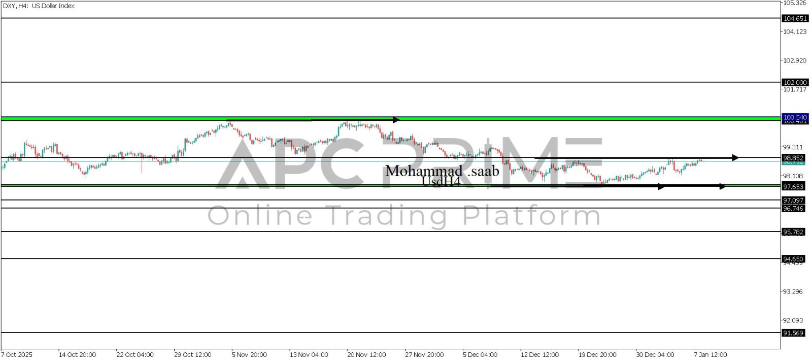 المنطقة الأهم (98.852) احتمالية الارتداد منها ممكنة ولكن باختراقها وإغلاق أعلى بشمعة أربع ساعات يتجه السعر إلى منطقة المقاومة (100.401-100.540) احتمالية الارتداد منها ممكنة ولكن باختراقها وإغلاق أعلى بشمعة أربع ساعات يتجه السعر إلى منطقة المقاومة (102.000)