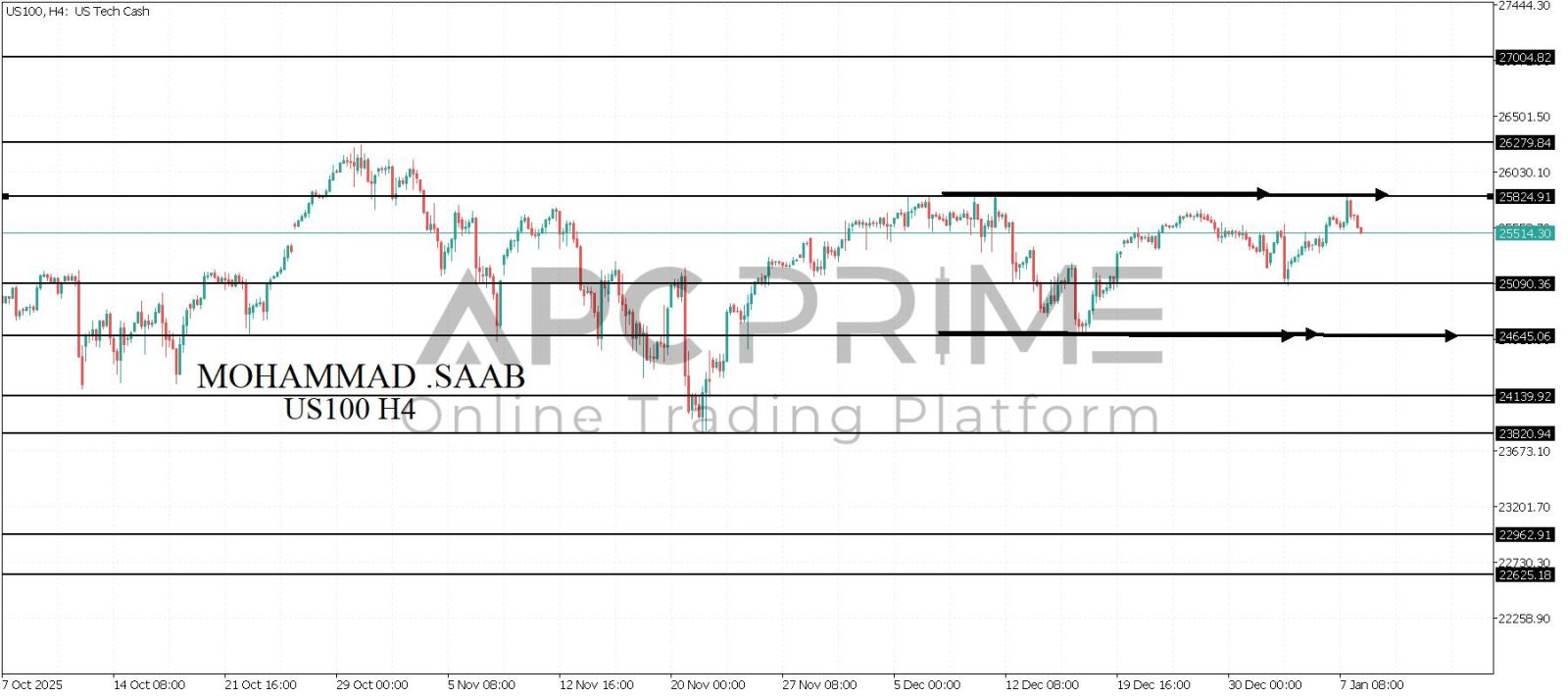 المنطقة الأهم (25824) احتمالية الارتداد منها ممكنة ولكن باختراقها وإغلاق أعلى بشمعة أربع ساعات يتجه السعر إلى منطقة المقاومة (26279) احتمالية الارتداد منها ممكنة ولكن باختراقها وإغلاق أعلى بشمعة أربع ساعات يتجه السعر إلى منطقة المقاومة (27004)