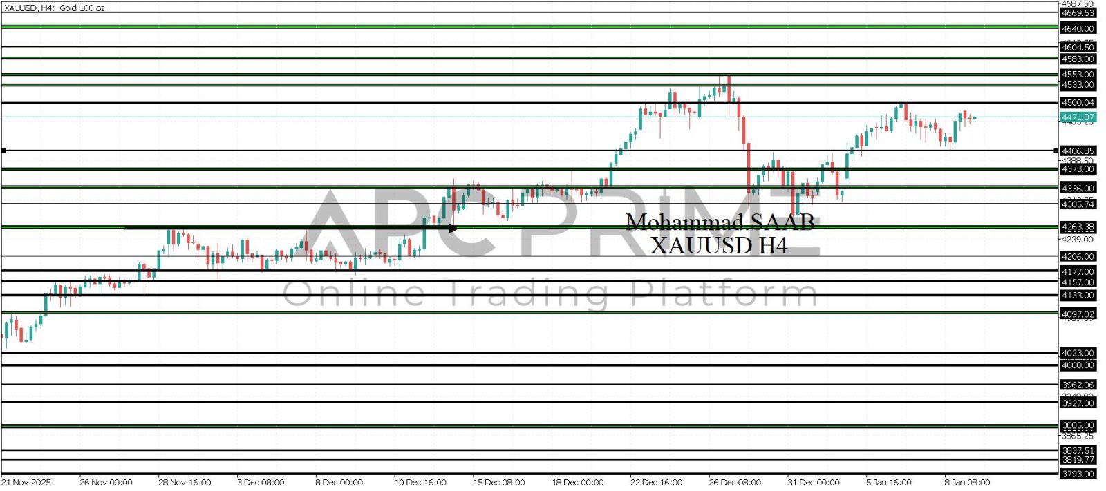 المنطقة الأهم (4406) ثبات السعر أعلى المنطقة الأهم يتجه السعر إلى منطقة المقاومة (4495-4500) احتمالية الارتداد منها ممكنة ولكن باختراقها وإغلاق أعلى بشمعة أربع ساعات يتجه السعر إلى منطقة المقاومة (4530-4533)