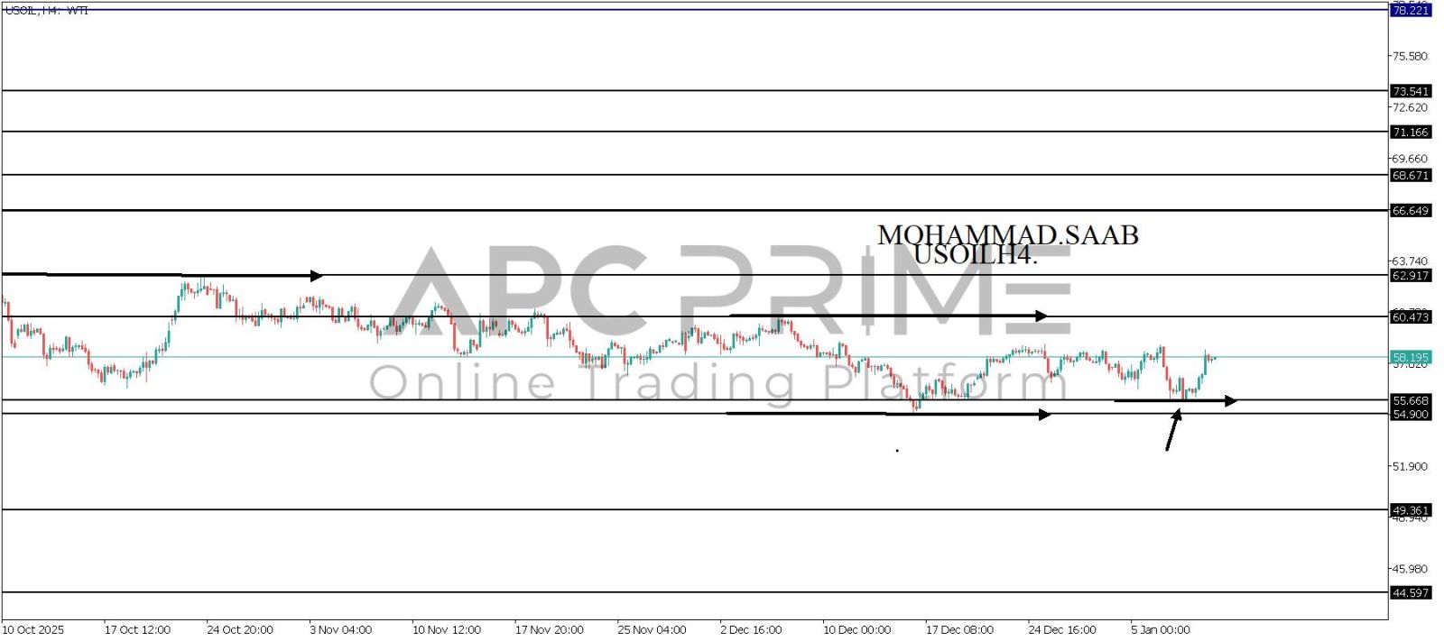 المنطقة الأهم (55.668) ثبات السعر أعلى المنطقة الأهم يتجه السعر إلى منطقة المقاومة (60.473) احتمالية الارتداد منها ممكنة ولكن باختراقها وإغلاق أعلى بشمعة أربع ساعات يتجه السعر إلى منطقة المقاومة (62.917)