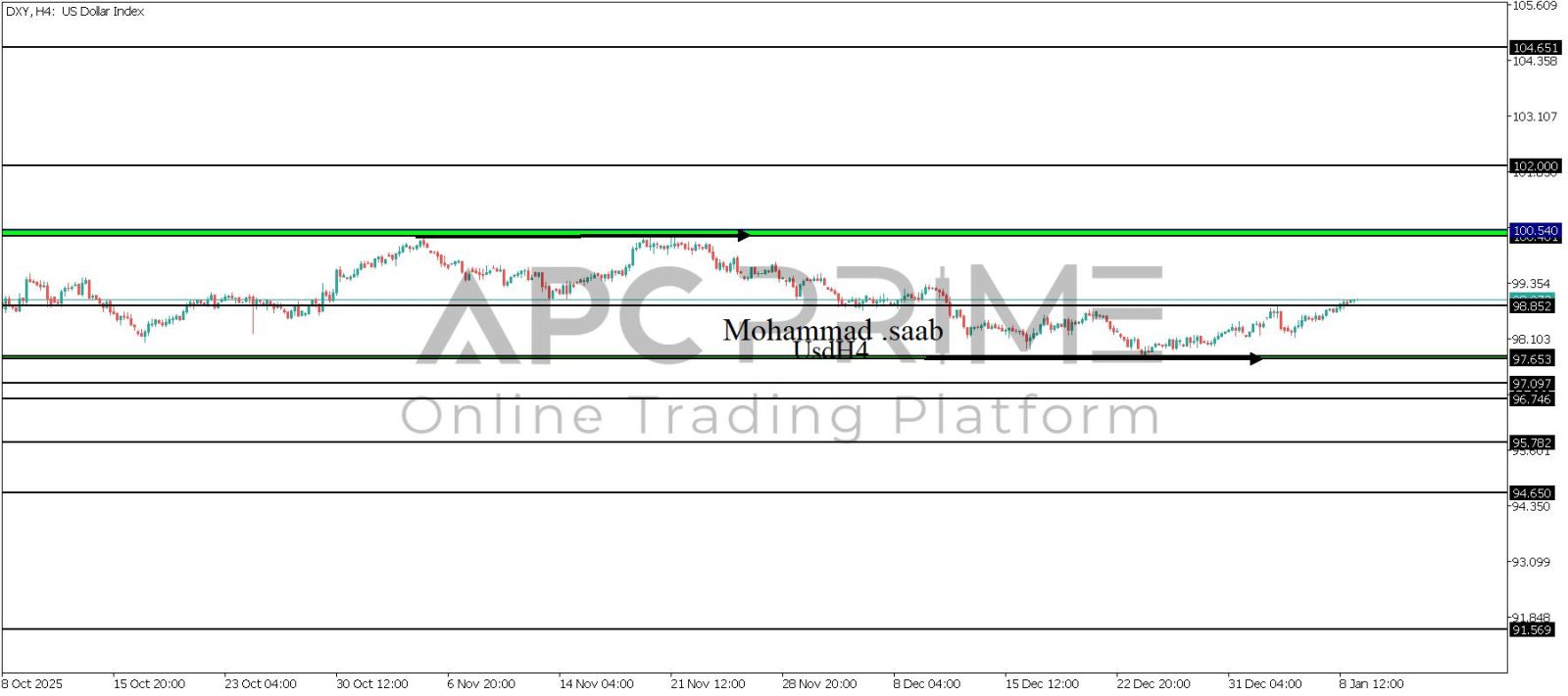 المنطقة الأهم (98.852) ثبات السعر أعلى المنطقة الأهم يتجه السعر إلى منطقة المقاومة (100.401-100.540) احتمالية الارتداد منها ممكنة ولكن باختراقها وإغلاق أعلى بشمعة أربع ساعات يتجه السعر إلى منطقة المقاومة (102.000)
