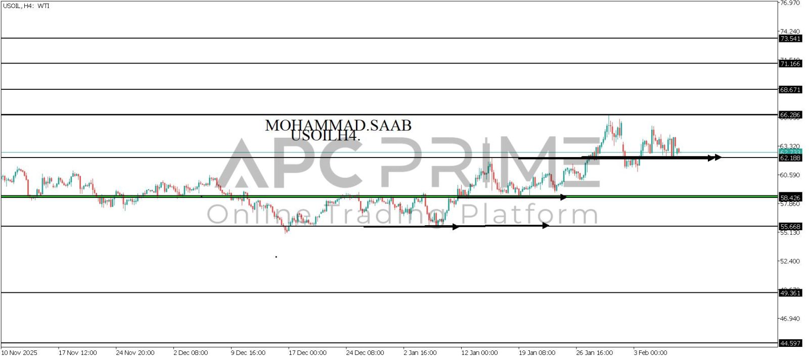 المنطقة الأهم (62.188) احتمالية الارتداد منها ممكنة ولكن بكسرها وإغلاق أسفل بشمعة أربع ساعات يتجه السعر إلى منطقة الدعم (58.426) احتمالية الارتداد منها ممكنة ولكن بكسرها وإغلاق أسفل بشمعة أربع ساعات يتجه السعر إلى منطقة الدعم (55.668)