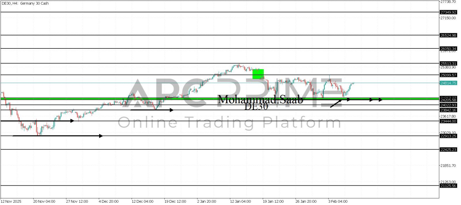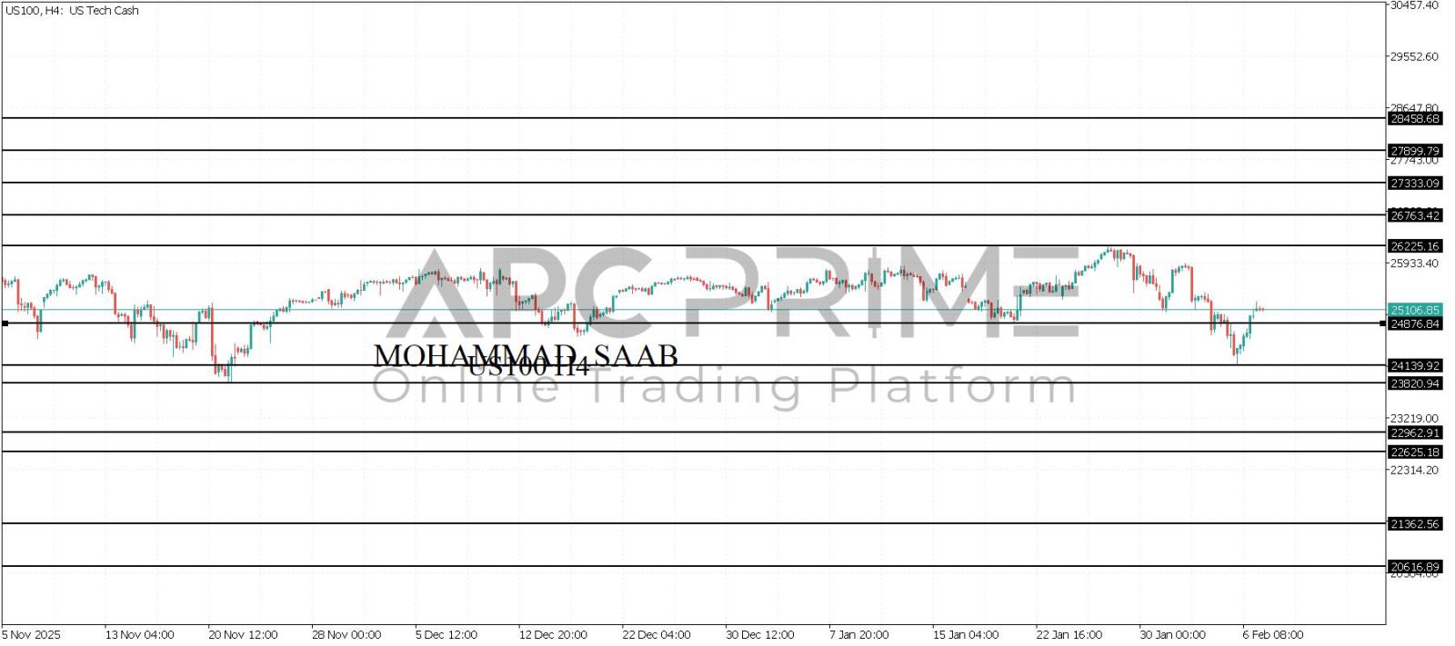 المنطقة الأهم (24876) ثبات السعر أعلى المنطقة الأهم يتجه السعر إلى منطقة المقاومة (26225) احتمالية الارتداد منها ممكنة ولكن باختراقها وإغلاق أعلى بشمعة أربع ساعات يتجه السعر إلى منطقة المقاومة (26763)