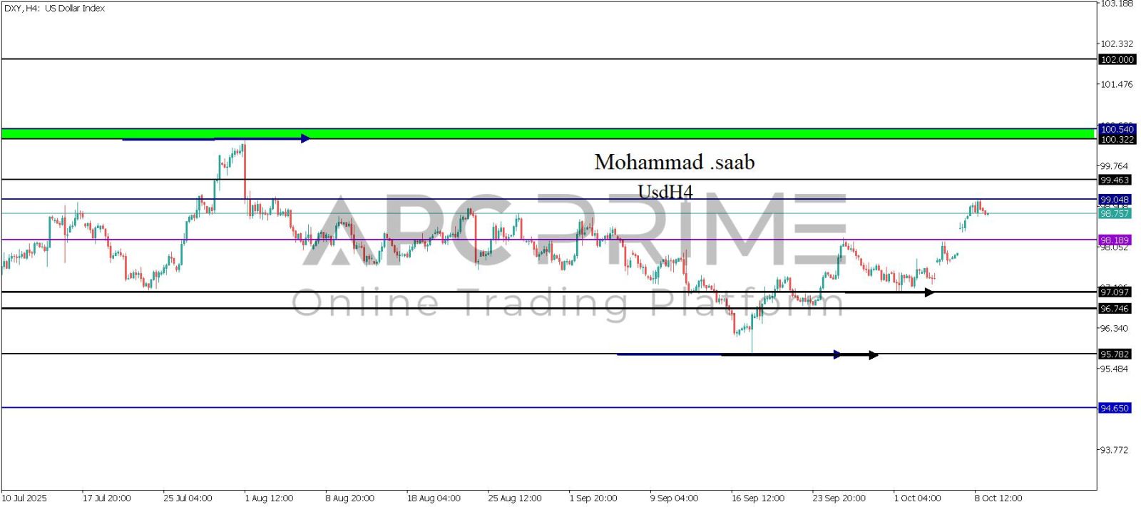 المنطقة الأهم (98.189) احتمالية الارتداد منها ممكنة ولكن بكسرها وإغلاق أسفل بشمعة أربع ساعات يتجه السعر إلى منطقة الدعم (97.097) احتمالية الارتداد منها ممكنة ولكن بكسرها وإغلاق أسفل بشمعة أربع ساعات يتجه السعر إلى منطقة الدعم (96.746)