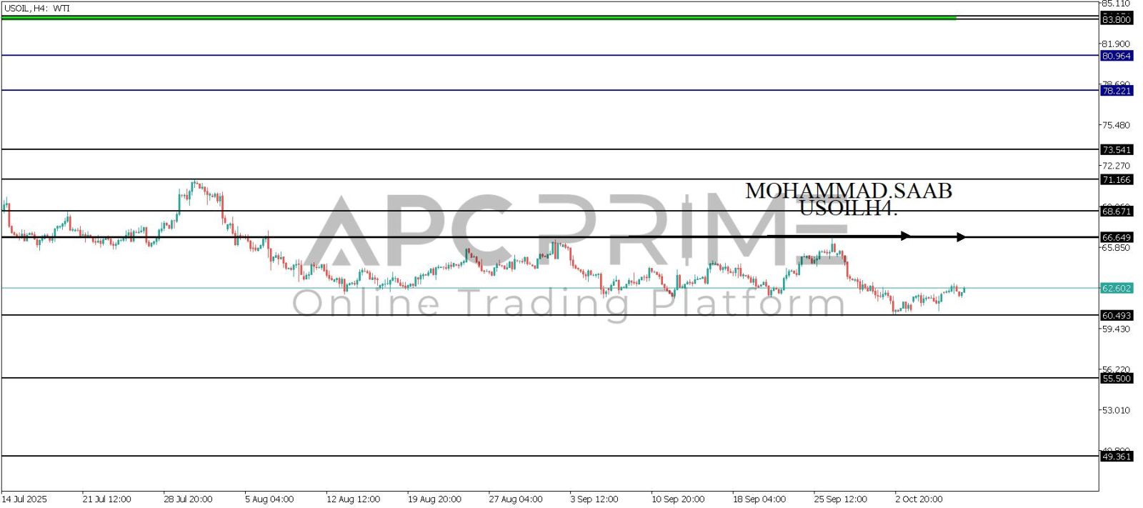 المنطقة الأهم (60.493) ثبات السعر أعلى المنطقة الأهم يتجه السعر إلى منطقة المقاومة (66.649) احتمالية الارتداد منها ممكنة ولكن باختراقها وإغلاق أعلى بشمعة أربع ساعات يتجه السعر إلى منطقة المقاومة (68.671)