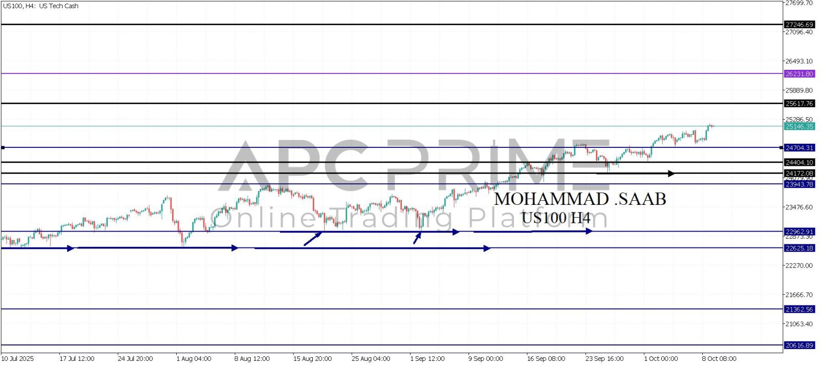 المنطقة الأهم (24704) ثبات السعر أعلى المنطقة الأهم يتجه السعر إلى منطقة المقاومة (25617) احتمالية الارتداد منها ممكنة ولكن باختراقها وإغلاق أعلى بشمعة أربع ساعات يتجه السعر إلى منطقة المقاومة (26231)