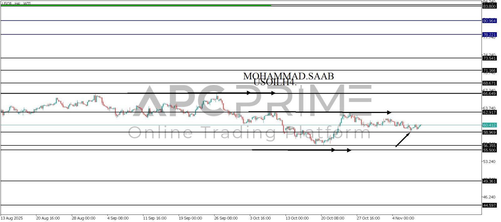 المنطقة الأهم (58.969) ثبات السعر أعلى المنطقة الأهم يتجه السعر إلى منطقة المقاومة (62.917) احتمالية الارتداد منها ممكنة ولكن باختراقها وإغلاق أعلى بشمعة أربع ساعات يتجه السعر إلى منطقة المقاومة (66.649)