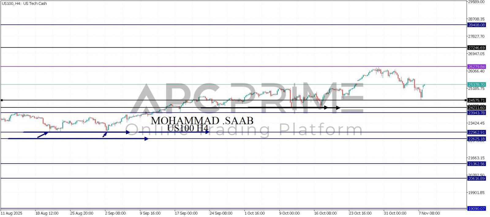المنطقة الأهم (24575) ثبات السعر أعلى المنطقة الأهم يتجه السعر إلى منطقة المقاومة (26279) احتمالية الارتداد منها ممكنة ولكن باختراقها وإغلاق أعلى بشمعة أربع ساعات يتجه السعر إلى منطقة المقاومة (27246)