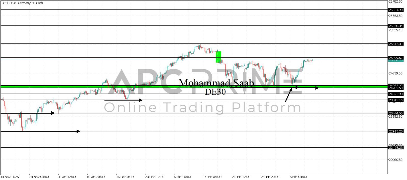 المنطقة الأهم (24205-24267) ثبات السعر أعلى المنطقة الأهم يتجه السعر إلى منطقة المقاومة (25099) احتمالية الارتداد منها ممكنة ولكن باختراقها وإغلاق أعلى بشمعة أربع ساعات يتجه السعر إلى منطقة المقاومة (25513)
