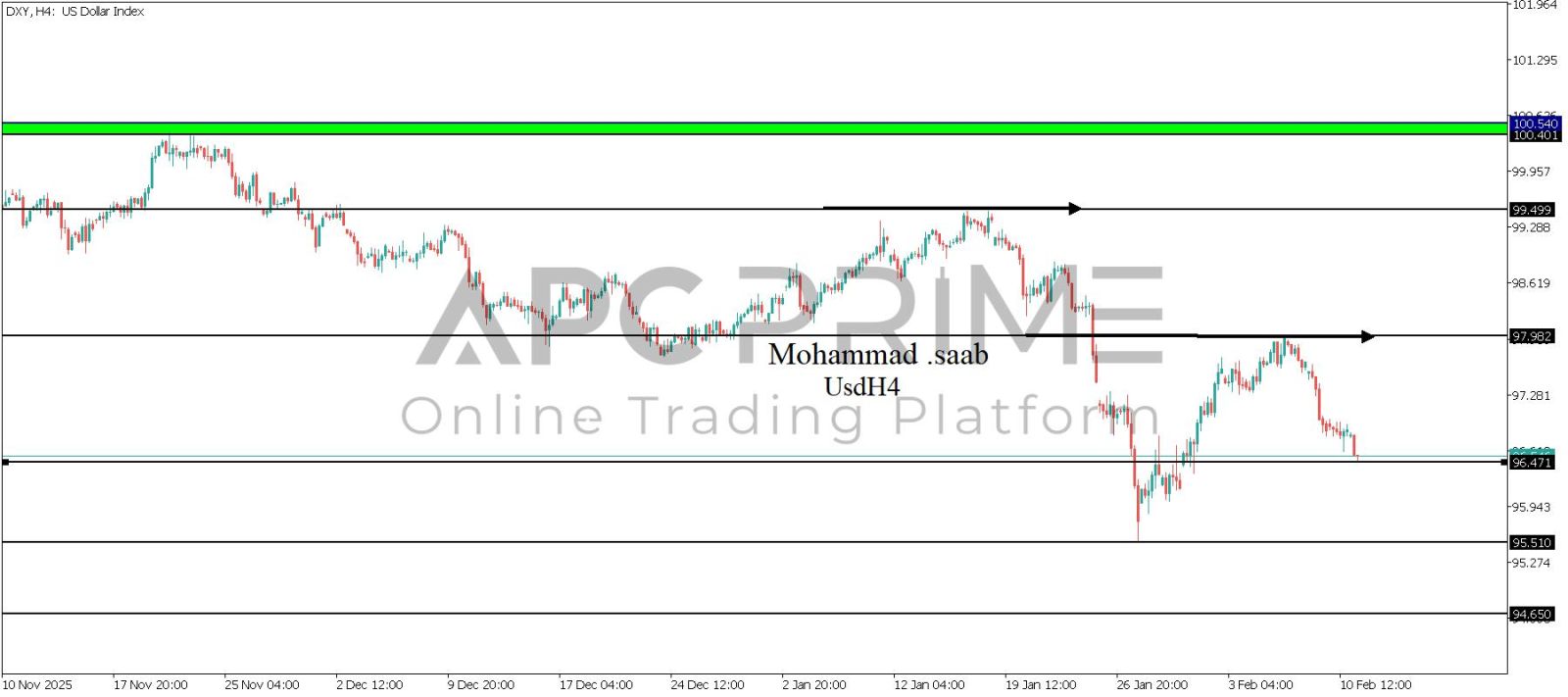 المنطقة الأهم (97.587) احتمالية الارتداد منها ممكنة ولكن باختراقها وإغلاق أعلى بشمعة أربع ساعات يتجه السعر إلى منطقة المقاومة (99.499) احتمالية الارتداد منها ممكنة ولكن باختراقها وإغلاق أعلى بشمعة أربع ساعات يتجه السعر إلى منطقة المقاومة (100.401-100.540)