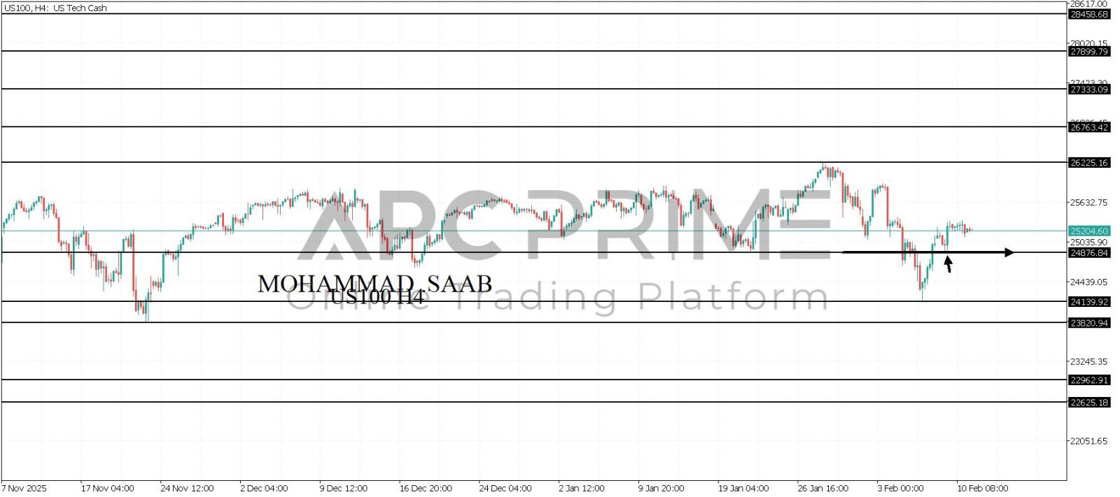 المنطقة الأهم (24876) ثبات السعر أعلى المنطقة الأهم يتجه السعر إلى منطقة المقاومة (26225) احتمالية الارتداد منها ممكنة ولكن باختراقها وإغلاق أعلى بشمعة أربع ساعات يتجه السعر إلى منطقة المقاومة (26763)