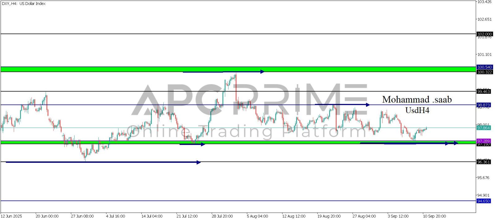 المنطقة الأهم (97.289-97.150) ثبات السعر أعلى المنطقة الأهم يتجه السعر إلى منطقة المقاومة (98.873) احتمالية الارتداد منها ممكنة ولكن باختراقها وإغلاق أعلى بشمعة أربع ساعات يتجه السعر إلى منطقة المقاومة (99.463)