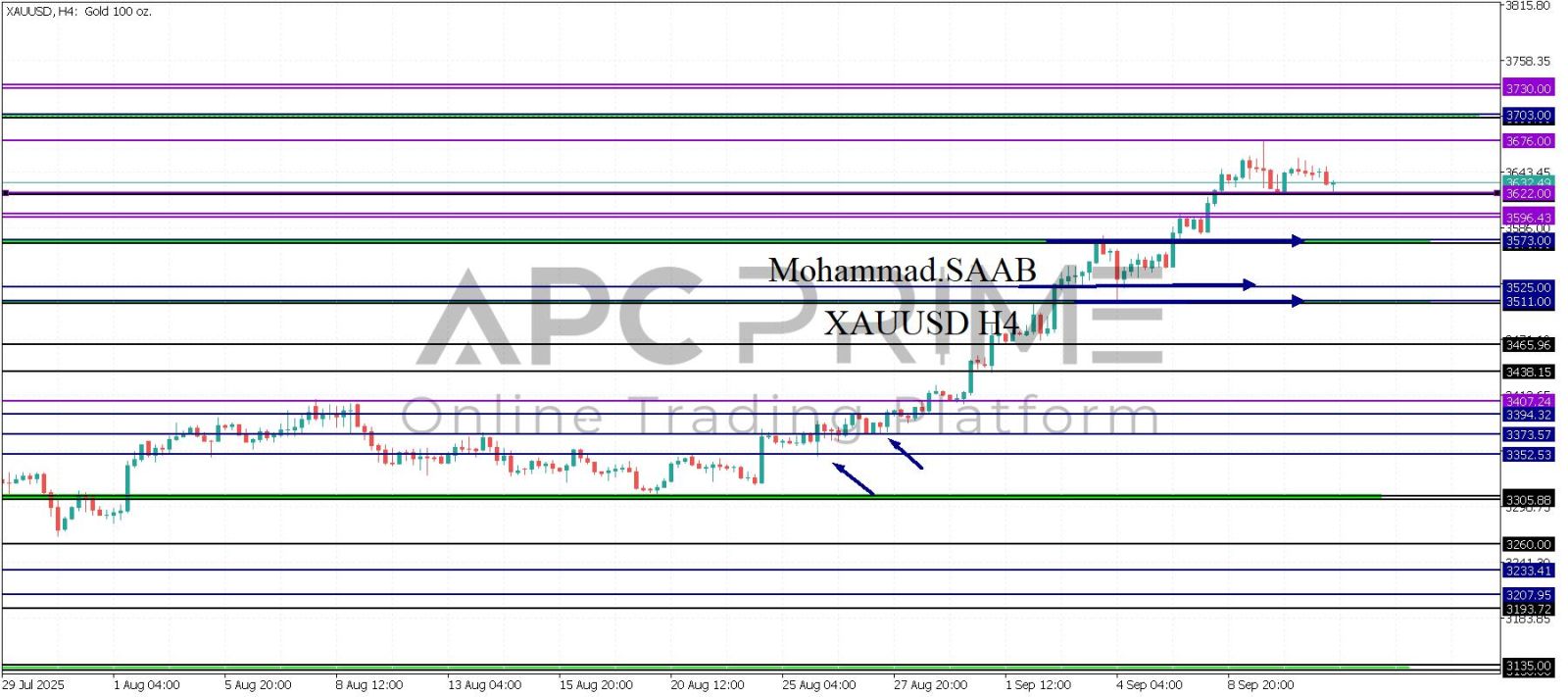 المنطقة الأهم (3622) احتمالية الارتداد منها ممكنة ولكن بكسرها وإغلاق أسفل بشمعة أربع ساعات يتجه السعر إلى منطقة الدعم (3596) احتمالية الارتداد منها ممكنة ولكن بكسرها وإغلاق أسفل بشمعة أربع ساعات يتجه السعر إلى منطقة الدعم (3573-3570)