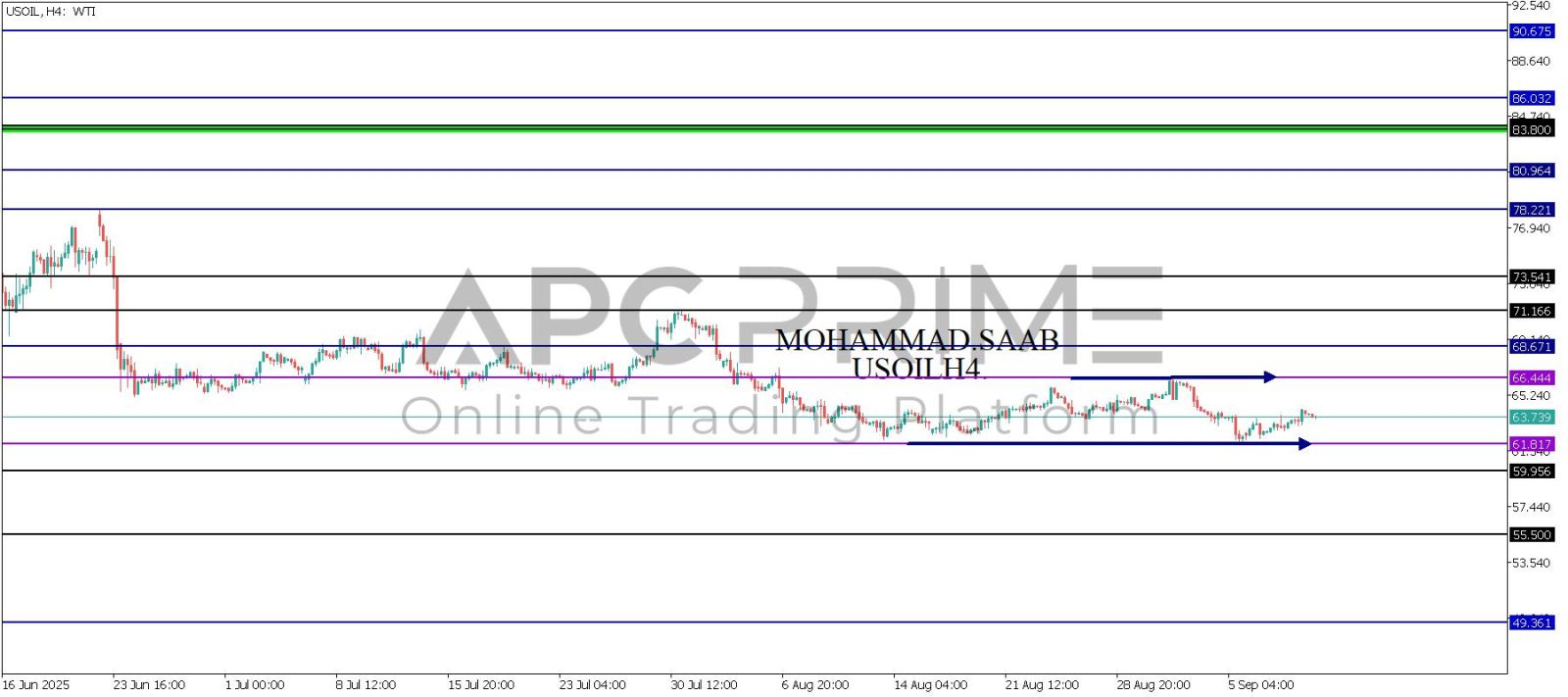 المنطقة الأهم (61.817) ثبات السعر أعلى المنطقة الأهم يتجه السعر إلى منطقة المقاومة (66.444) احتمالية الارتداد منها ممكنة ولكن باختراقها وإغلاق أعلى بشمعة أربع ساعات يتجه السعر إلى منطقة المقاومة (68.671)