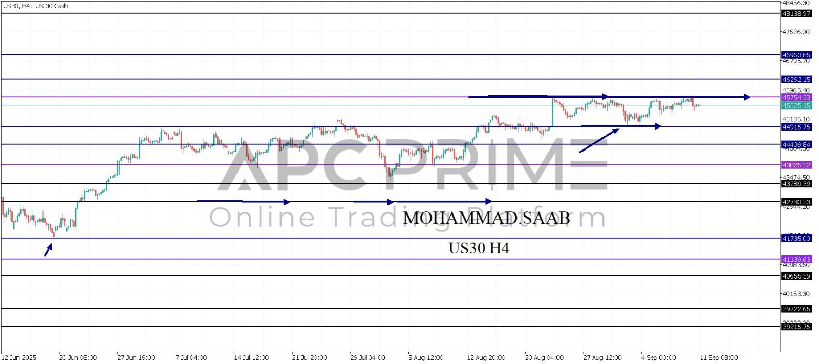 المنطقة الأهم (45754) احتمالية الارتداد منها ممكنة ولكن باختراقها وإغلاق أعلى بشمعة أربع ساعات يتجه السعر إلى منطقة المقاومة (46262) احتمالية الارتداد منها ممكنة ولكن باختراقها وإغلاق أعلى بشمعة أربع ساعات يتجه السعر إلى منطقة المقاومة (46960)
