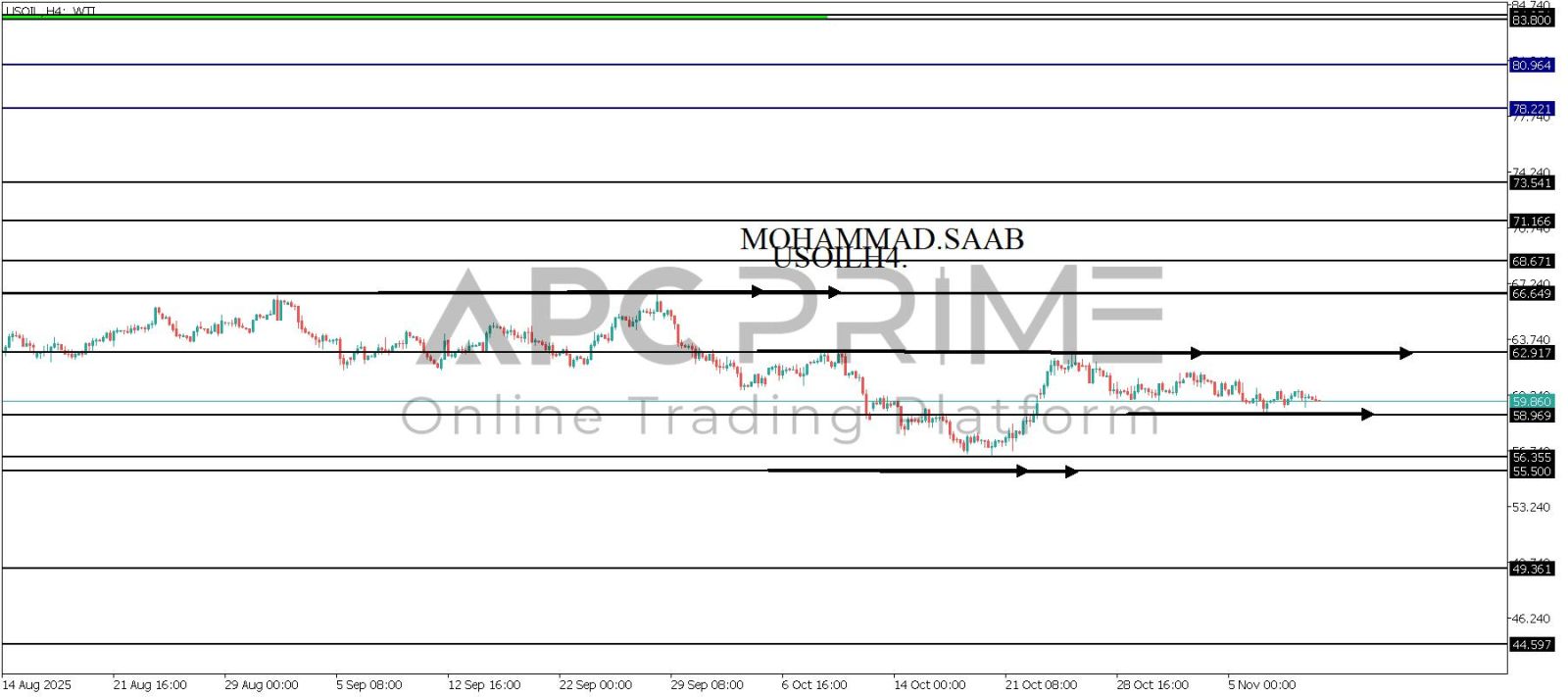 المنطقة الأهم (58.969) احتمالية الارتداد منها ممكنة ولكن بكسرها وإغلاق أسفل بشمعة أربع ساعات يتجه السعر إلى منطقة الدعم (56.355) احتمالية الارتداد منها ممكنة ولكن بكسرها وإغلاق أسفل بشمعة أربع ساعات يتجه السعر إلى منطقة الدعم (55.500)