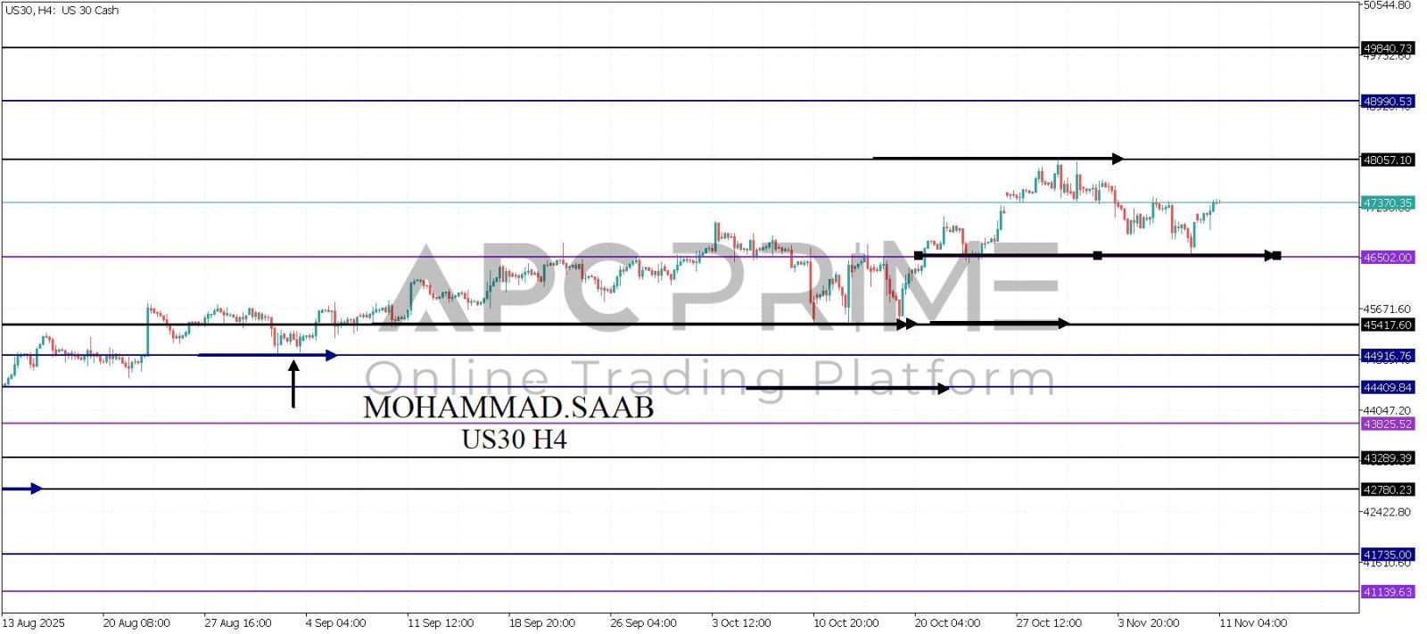 المنطقة الأهم (46502) ثبات السعر أعلى المنطقة الأهم يتجه السعر إلى منطقة المقاومة (48057) احتمالية الارتداد منها ممكنة ولكن باختراقها وإغلاق أعلى بشمعة أربع ساعات يتجه السعر إلى منطقة المقاومة (48990)
