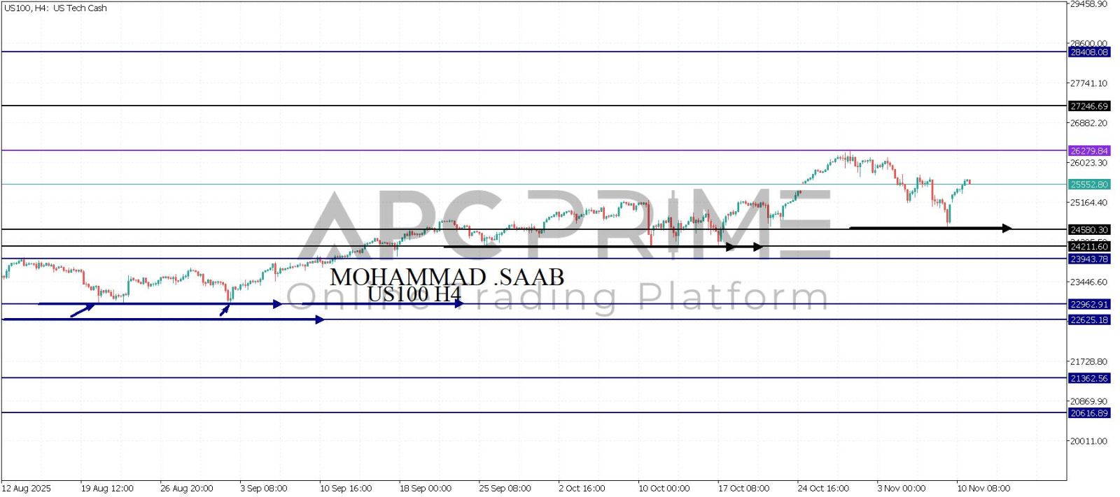 المنطقة الأهم (24580) ثبات السعر أعلى المنطقة الأهم يتجه السعر إلى منطقة المقاومة (26279) احتمالية الارتداد منها ممكنة ولكن باختراقها وإغلاق أعلى بشمعة أربع ساعات يتجه السعر إلى منطقة المقاومة (27246)