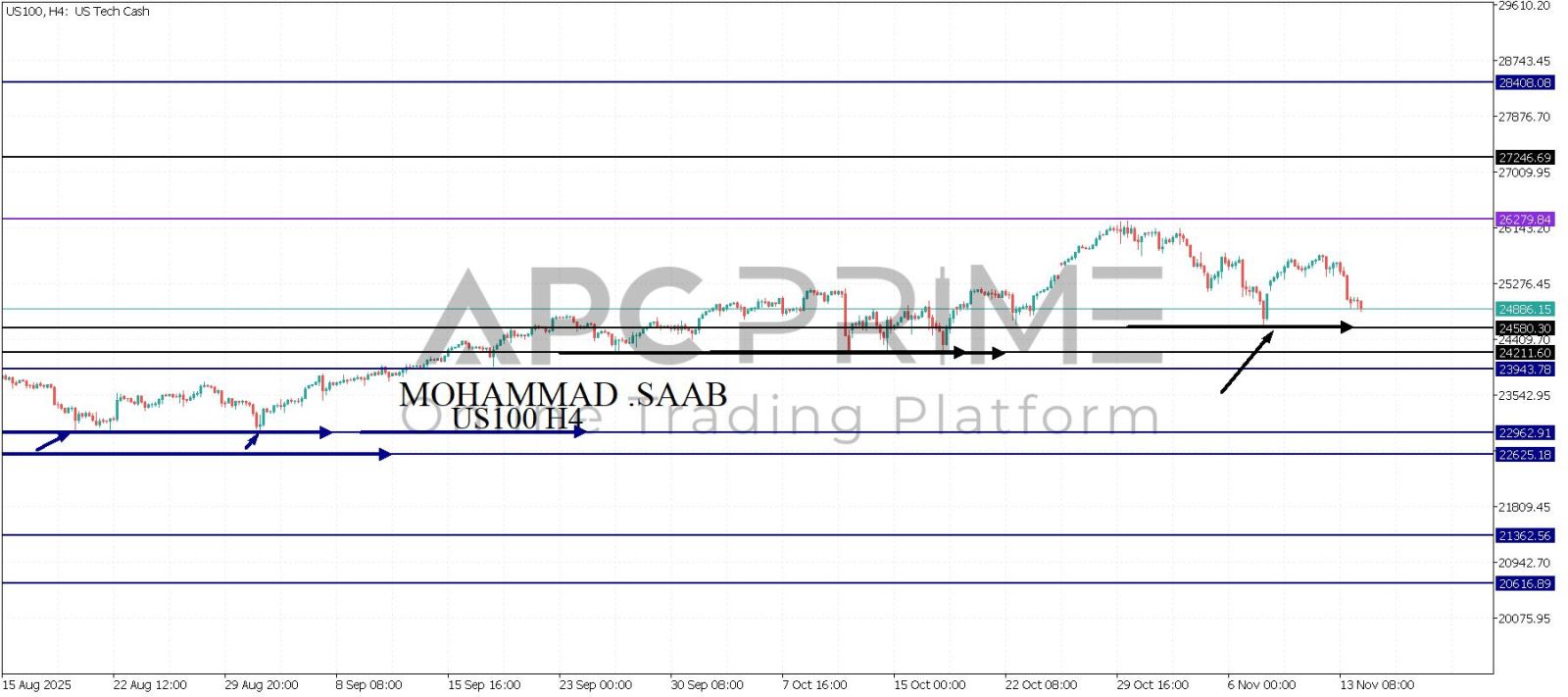 المنطقة الأهم (24580) احتمالية الارتداد منها ممكنة ولكن بكسرها وإغلاق أسفل بشمعة أربع ساعات يتجه السعر إلى منطقة الدعم (24211) احتمالية الارتداد منها ممكنة ولكن بكسرها وإغلاق أسفل بشمعة أربع ساعات يتجه السعر إلى منطقة الدعم (23943)