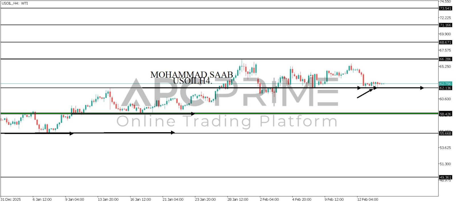 المنطقة الأهم (62.136) احتمالية الارتداد منها ممكنة ولكن بكسرها وإغلاق أسفل بشمعة أربع ساعات يتجه السعر إلى منطقة الدعم (58.426) احتمالية الارتداد منها ممكنة ولكن بكسرها وإغلاق أسفل بشمعة أربع ساعات يتجه السعر إلى منطقة الدعم (55.668)