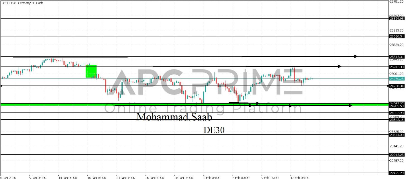 المنطقة الأهم (24738) ثبات السعر أعلى المنطقة الأهم يتجه السعر إلى منطقة المقاومة (25242) احتمالية الارتداد منها ممكنة ولكن باختراقها وإغلاق أعلى بشمعة أربع ساعات يتجه السعر إلى منطقة المقاومة (25513)