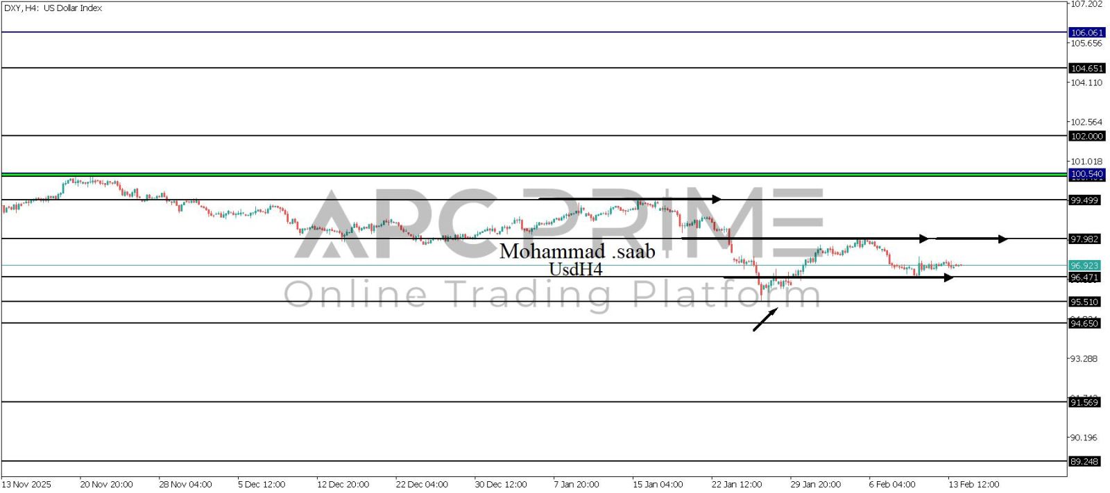 المنطقة الأهم (96.471) ثبات السعر أعلى المنطقة الأهم يتجه السعر إلى منطقة المقاومة (97.982) احتمالية الارتداد منها ممكنة ولكن باختراقها وإغلاق أعلى بشمعة أربع ساعات يتجه السعر إلى منطقة المقاومة (99.499)