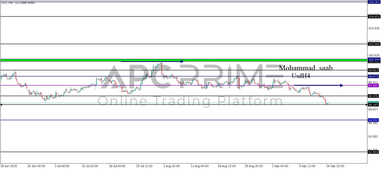 المنطقة الأهم (96.147) ثبات السعر أعلى المنطقة الأهم يتجه السعر إلى منطقة المقاومة (96.976) احتمالية الارتداد منها ممكنة ولكن باختراقها وإغلاق أعلى بشمعة أربع ساعات يتجه السعر إلى منطقة المقاومة (97.997)