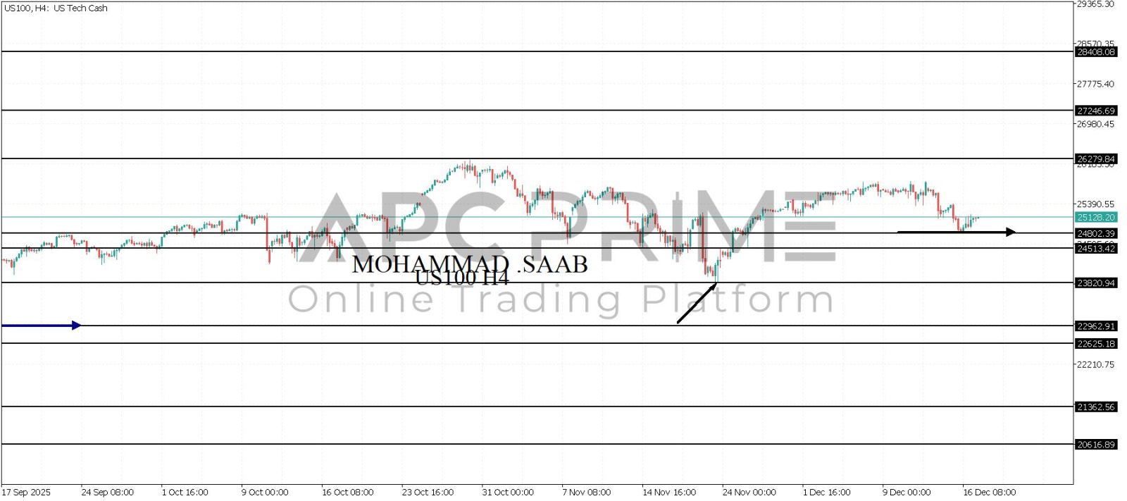 المنطقة الأهم (24802) ثبات السعر أعلى المنطقة الأهم يتجه السعر إلى منطقة المقاومة (26279) احتمالية الارتداد منها ممكنة ولكن باختراقها وإغلاق أعلى بشمعة أربع ساعات يتجه السعر إلى منطقة المقاومة (27246)