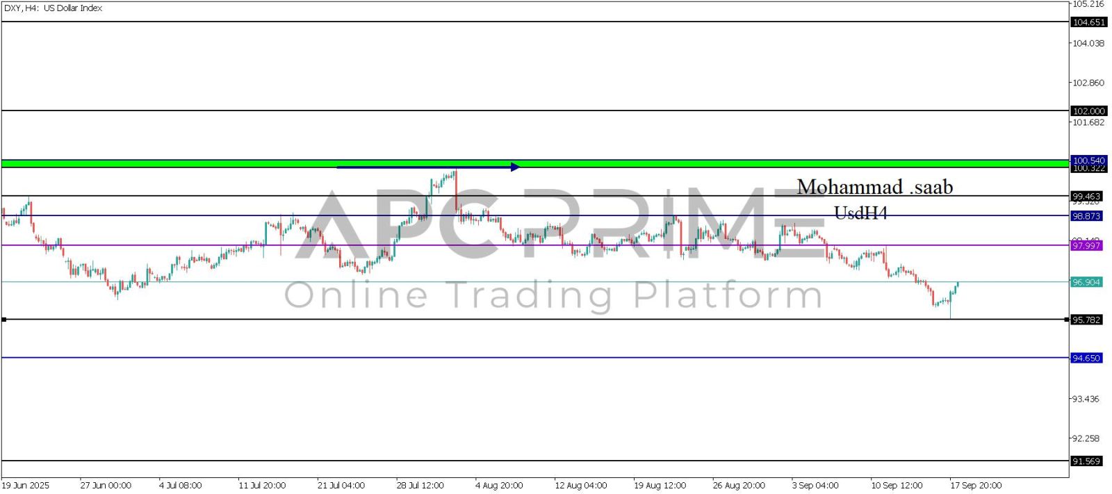 المنطقة الأهم (95.782) ثبات السعر أعلى المنطقة الأهم يتجه السعر إلى منطقة المقاومة (97.997) احتمالية الارتداد منها ممكنة ولكن باختراقها وإغلاق أعلى بشمعة أربع ساعات يتجه السعر إلى منطقة المقاومة (98.873)